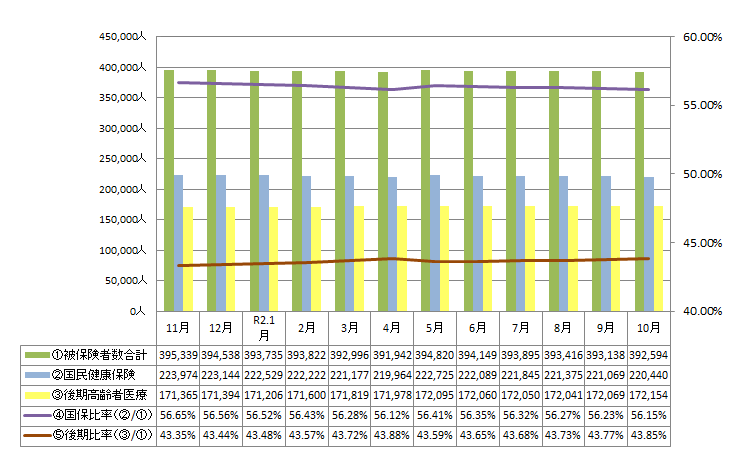 令和元年11月からの1年間で、令和2年10月の被保険者数合計は、2,745人減の392,594人となった。うち国民健康保険は3,534人減の220,440人、後期高齢者医療は789人増の172,154人となった。