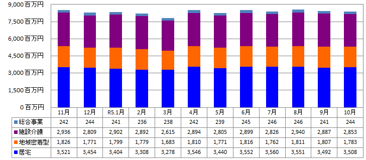 令和4年11月から令和5年10月のサービス別介護給付費の平均額は総合事業242百万円、施設介護2,855百万円、地域密着型1,785百万円、居宅3,464百万円となり、令和5年10月のサービス別介護給付費は総合事業と居宅のサービスで年間平均額を上回った。
